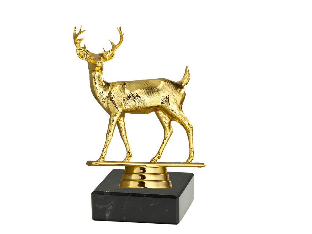 Figurka jelen zlatá 114 mm – Dekorativní zlatá soška jelena, vhodná jako trofej pro myslivecké nebo přírodní soutěže. Soška bez emblému.Doplňkové parametry