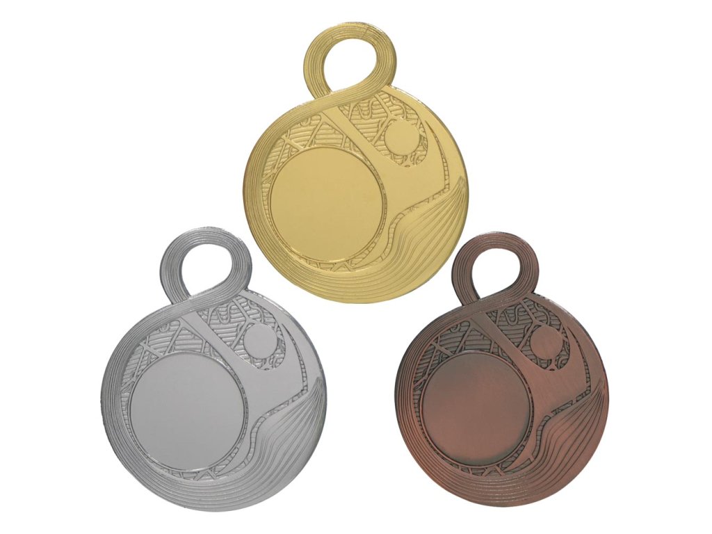 Medaile o průměru 50 mm s možností umístění popisu na zadní stranu medaile kruhovým štítkem v průměru 42 mm dle zadaného textu. Texty na štítky vždy centrujeme na střed.Stuhy, štítky, případně emblémy viz nabídka níže.